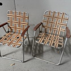 - Folding chair - brown orange sand stripe - yellow armrests - the arm rests are quite damaged - see pic - $25 each