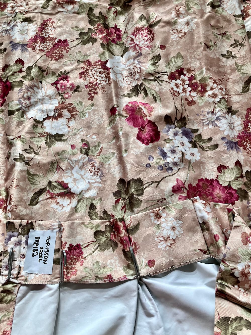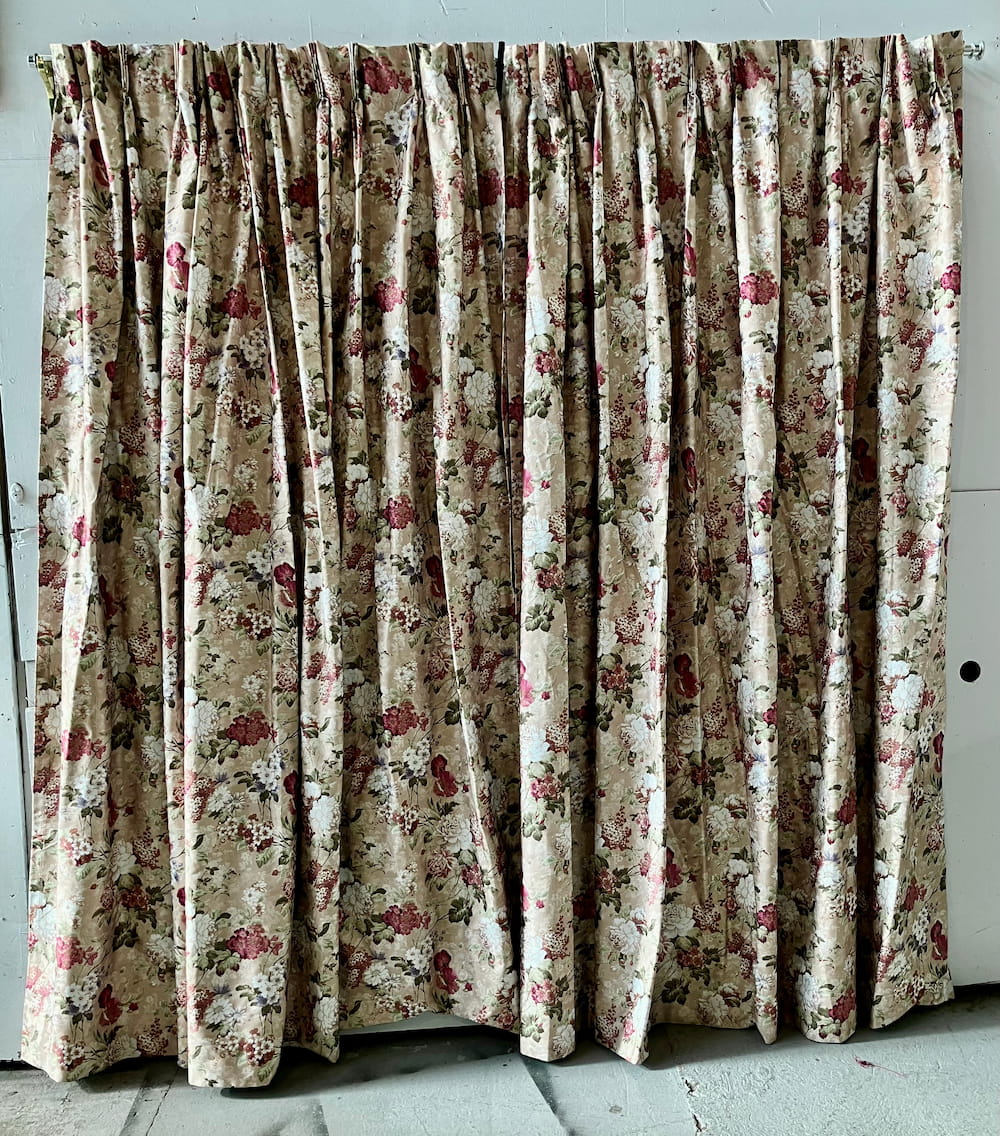 Modern chintzy pleated drapes with burgundy and white florals on beige