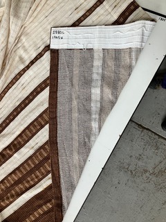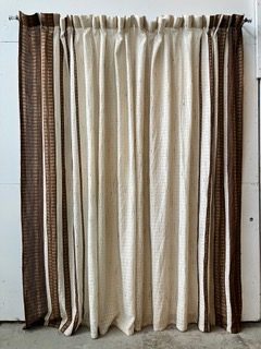 Off-white pleated drapes with vertical brown stripes