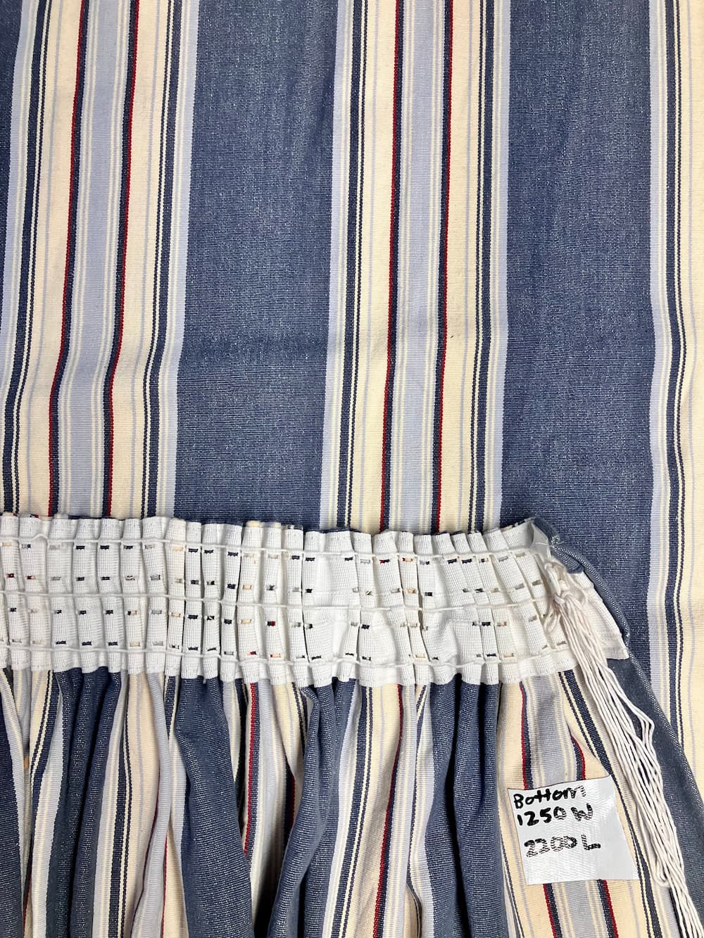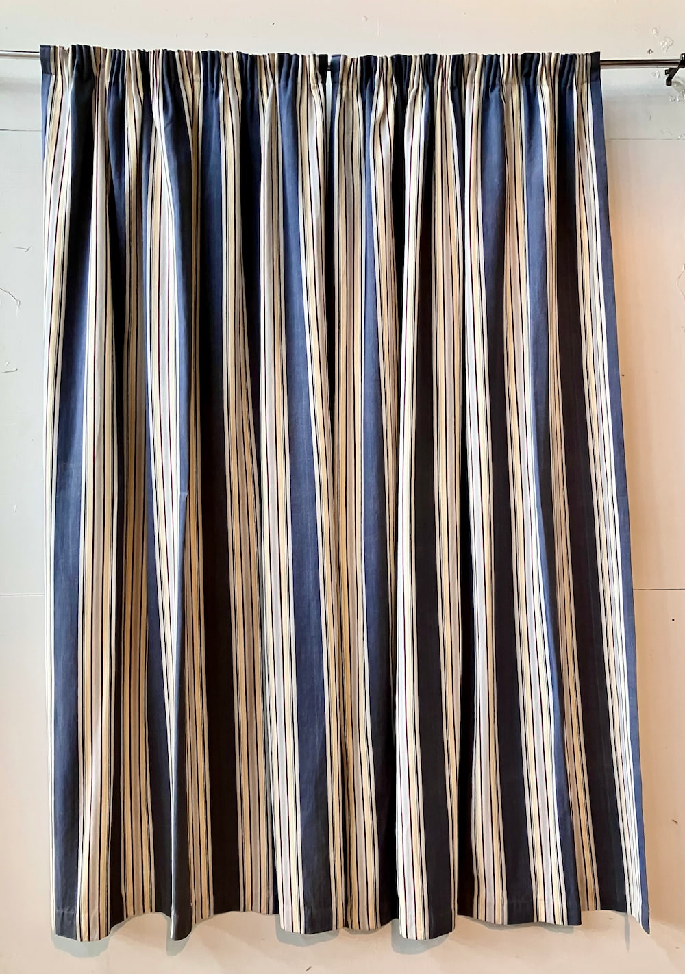 Yacht rock/ beach house blue denim curtains with yellow, red and blue pin stripes
