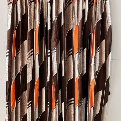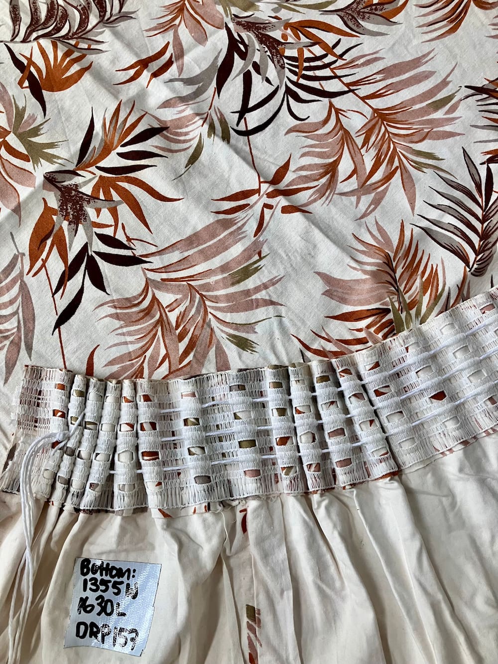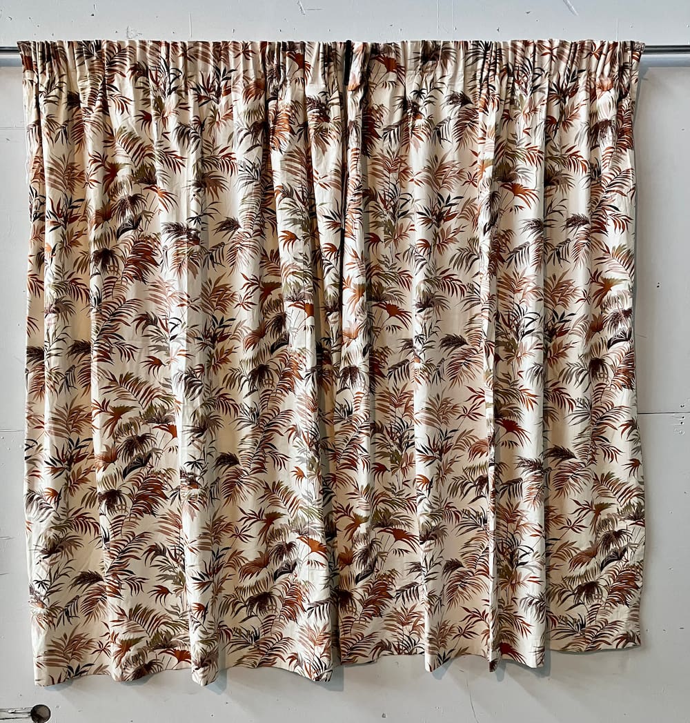 Retro style curtains; brown palm frond print on white